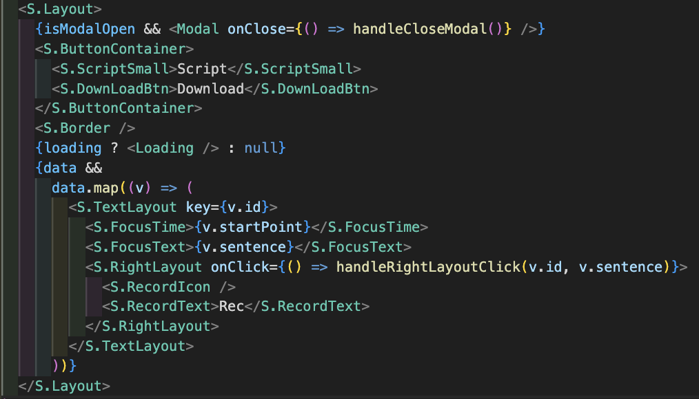 모달창 같은 경우는 Script 컴포넌트의 Rec 버튼을 누를 때 열려야 하기때문에 Script에 아래처럼 삽입되어 있다