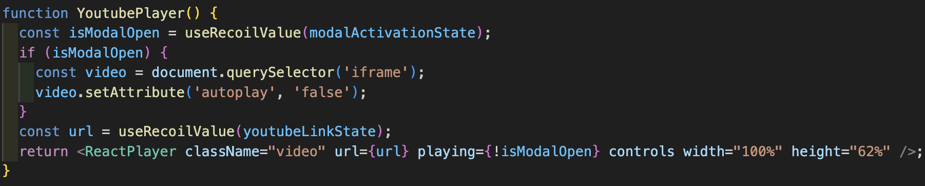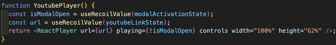 function YoutubePlayer() { const url = useRecoilValue(youtubeLinkState); return <ReactPlayer url={url} playing controls width="100%" height="62%" />; }ReactPlayer의 playing 속성이 boolean 타입으로 영상 재생을 책임지는 아이이다