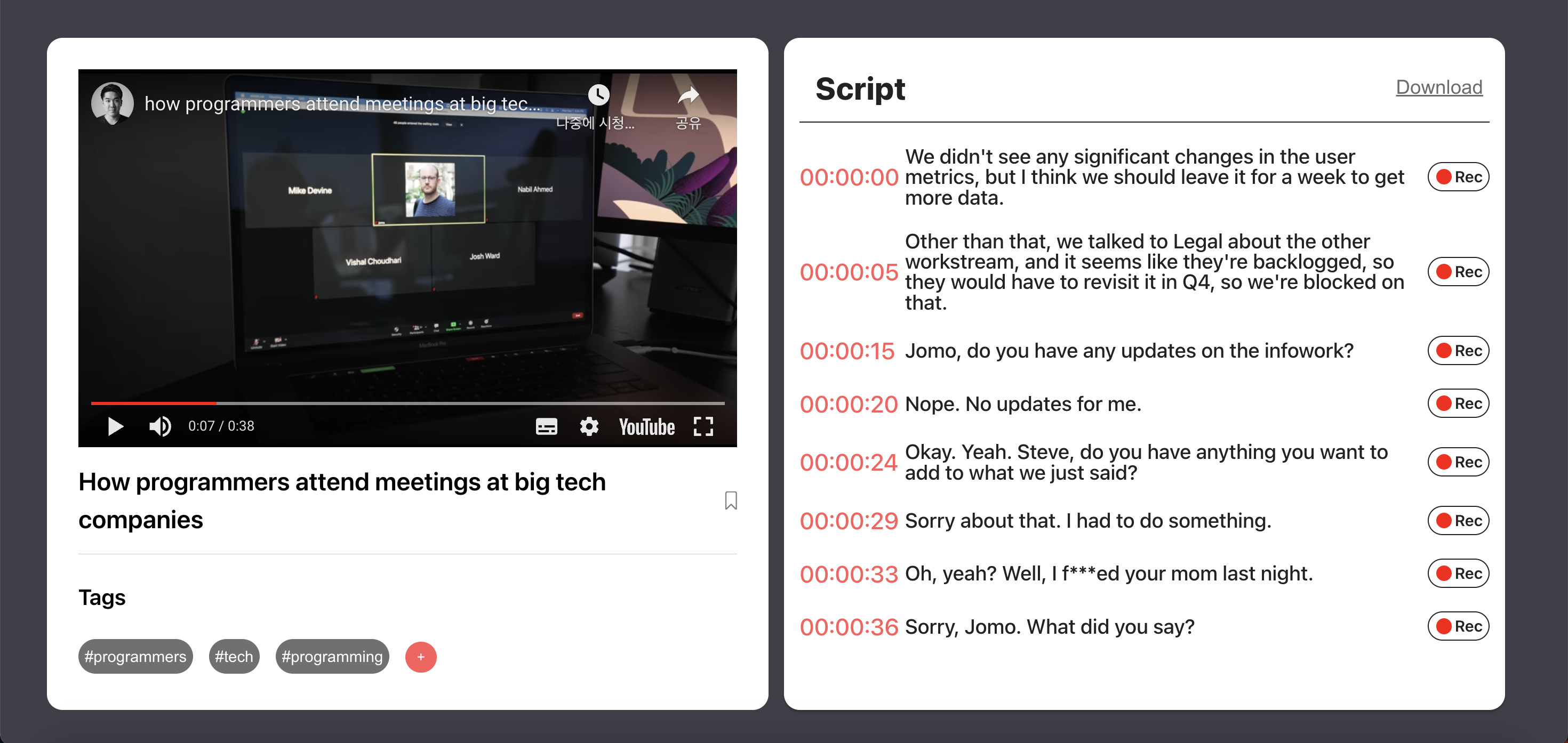 YoutubePlayer 컴포넌트(왼)와 Script 컴포넌트(오)는 모두 ScriptPage에 렌더링되어 있다