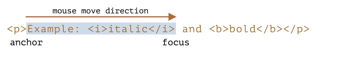 반대의 경우, selection은 backward 방향을 가진다. 이 경우 focus는 anchor보다 앞에 있다.